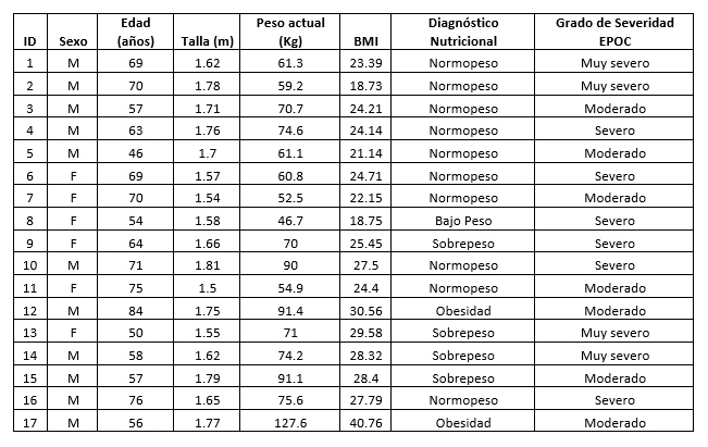 Estudios realizados con anterioridad indican que existe una variación en la composición corporal con el avance de los estadios en participantes con EPOC, siendo característico de las primeras etapas un aumento de la masa grasa corporal y una disminución de la masa muscular. Un paciente que es tratado únicamente con el dato de su peso podría verse afectado ya que se indicaría un plan "hipocalórico" y no se tendría en cuenta la disminución de la masa muscular que se ve agravada con el avance de la patología y, según bibliografía se correlaciona con un peor pronóstico del a misma1,2,3,4.