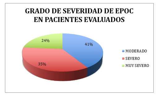 Se clasificó a los pacientes según el grado de EPOC en "moderado" aquellos con un VEF1 ? 50% y <80%, "severo" si el VEF1 ? 30% y <50% y "muy severo" cuando los valores de VEF1 fueron < 30% (Clasificación establecida por la Iniciativa global para la enfermedad pulmonar obstructiva crónica).