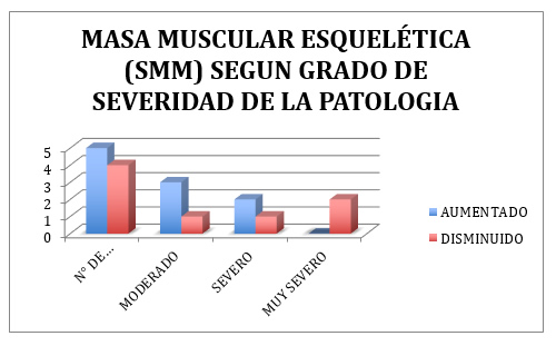 Se evidenció una disminución de la SMM en el 24% de los pacientes, mayor en aquellos con grado muy severo de la enfermedad ya que los pacientes que entraban en esta categoría (2) presentaban este parámetro disminuido.