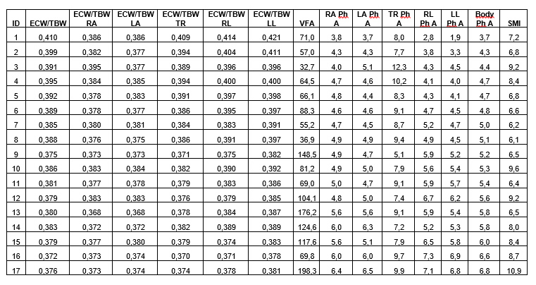 La ECW / TBW diagnostica Edema con valores mayores o iguales a 0,39. Respecto al diagnóstico de Sarcopenia, el punto de corte del SMI es de 7Kg/m2 en hombres y de 5,7Kg/m2 en mujeres. Por último, el Ph A diagnostica bajo grado de supervivencia en los pacientes que presentan valores menores o iguales a 4°.