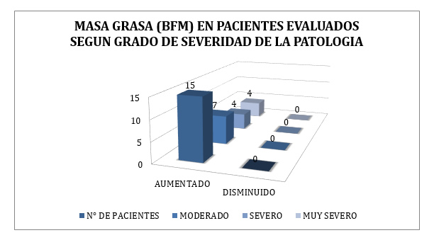 Sin embargo, cuando se estudiaron parámetros que evaluaban los distintos compartimentos corporales, se pudo observar que la BFM se encontraba aumentada en más de la mitad de los pacientes (11), en los 3 grados de severidad de la EPOC, y disminuida en 2 (1 paciente con grado moderado y otro con grado severo). (Tabla 2 y Gráfico 3)