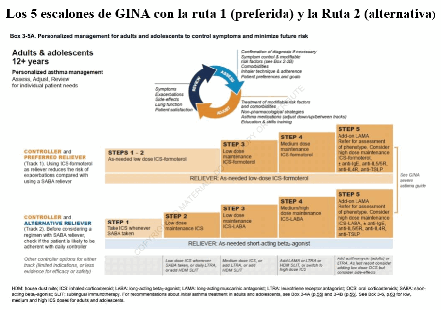 A diferencia de Gina, Gema propugna 6 escalones donde recomienda, en escalón 1 SABA a demanda y en escalón 2, el uso de CI a baja dosis de base con SABA o Formoterol /ICS a demnada , para lograr mayor control. Gina propone, en el Trak 1 y en los primeros 2 escalones, Formoterol / ICS a demanda y lo fundamenta en mayor eficacia en evitar exacerbaciones severas.